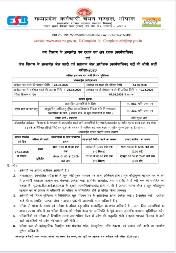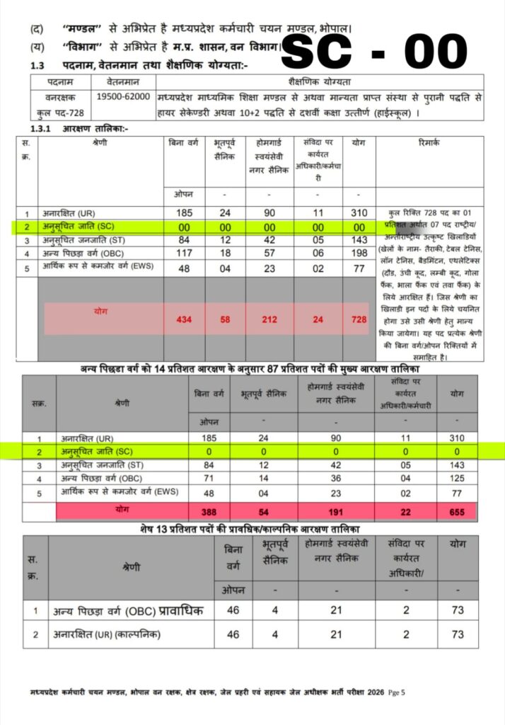 मध्यप्रदेश कर्मचारी चयन मंडल द्वारा जारी वन विभाग एवं जेल विभाग की सीधी भर्ती परीक्षा–2026 के नोटिफिकेशन में अनुसूचित जाति (SC) वर्ग के लिए पदों का शून्य या नगण्य निर्धारण किए जाने पर राजनीतिक विवाद गहराता जा रहा है।