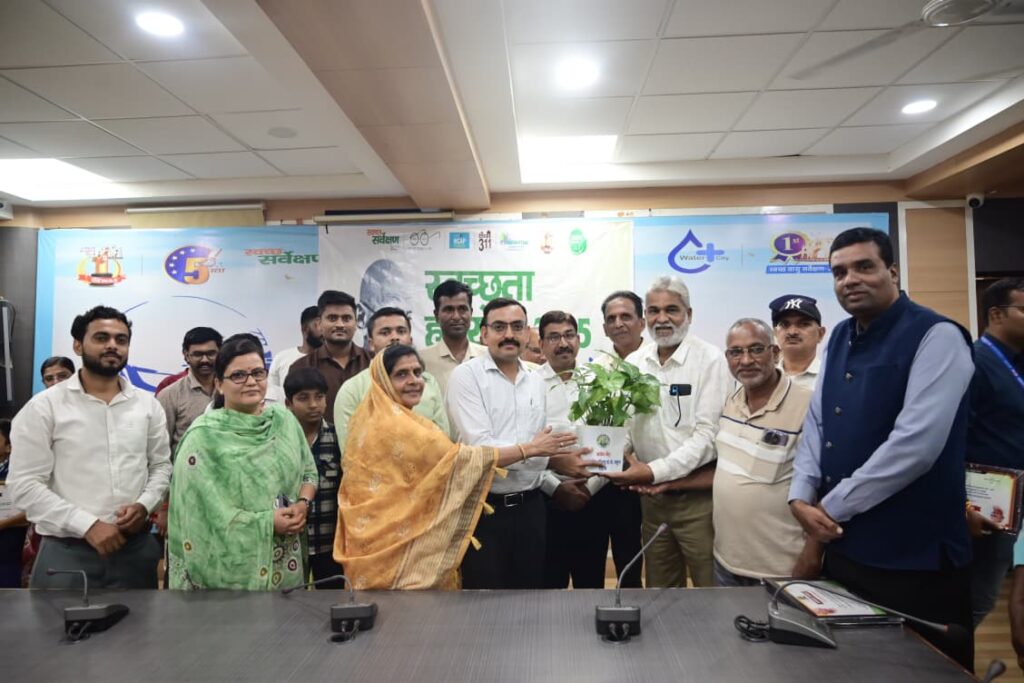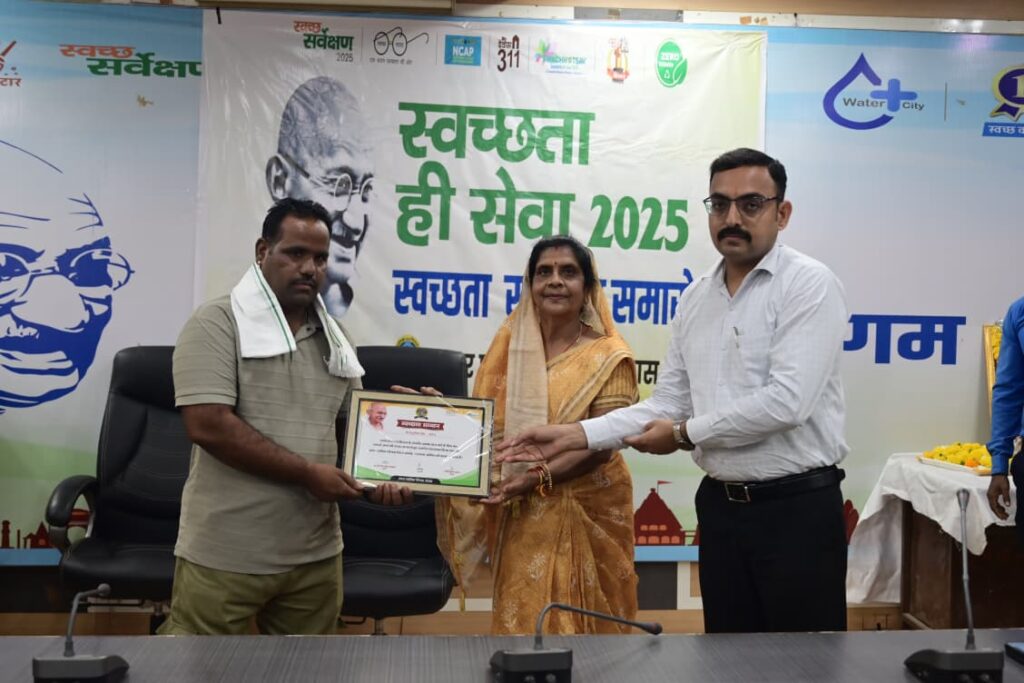 देवास। गुरूवार 2 अक्टूबर 2025 को राष्ट्रपिता महात्मा गांधी जी की जयंती के उपलक्ष्य में स्वच्छता ही सेवा 2025 सम्मान समारोह नगर निगम सभा कक्ष में आयोजित किया गया। आयोजन का शुभारंभ माननीय महापौर श्रीमती गीता दुर्गेश अग्रवाल एवं नगर निगम आयुक्त दलीप कुमार द्वारा महात्मा गांधी जी के चित्र पर दीप प्रज्वलित कर व माल्यार्पण किया गया। आयोजन के अंतर्गत स्वच्छता ही सेवा पखवाड़ 17 सितंबर से 2 अक्टूबर तक आयोजित किए जाने वाले स्वच्छता कार्यक्रम के दौरान स्वच्छता के प्रति योगदान देने वालों व स्वच्छता को बढ़ावा देने वाले कॉलेज, अस्पताल, शासकीय व अशासकीय स्कुलों सामाजिक संगठनों, खेल विभाग, मलेरिया विभाग, एनजीओ आदि जो विभिन्न गतिविधियों, जैसे सामुदायिक सेवा या जागरूकता अभियानों में अपनी निस्वार्थ सहभागिता से शहरवासियों को जागरूकता संदेश देने का काम किया है। समारोह के दौरान ऐसे व्यक्तियों और संगठनों को भी सम्मानित किया गया जिन्होंने “स्वच्छता ही सेवा” अभियान के दौरान स्वच्छता को बढ़ावा देने में महत्वपूर्ण भूमिका निभाई है। महापौर व आयुक्त के द्वारा 21 सफाई मित्र, केपी कॉलेज, 12 शासकीय व अशासकीय स्कुल मे नारायण विद्या मंदिर क्रमांक 1, शासकीय महांकाल कालोनी स्कुल, सरदाना इंटरनेशनल स्कुल, सांईनाथ मेमोरियल स्कुल, इनोवेटिव पब्लिक हायर सेकेन्ड्री स्कुल, हिमालय ऐकेडमी, ट्रिकी कोचिंग क्लास, ग्रीन आर्मी, न्यू ऐरा हायर सेकेन्ड्री स्कुल, एमरोल ऐकेडमी, बिरला स्कुल, सेंटर फर एडवांस रिसर्च एण्ड डेवलपमेंट, निबंध प्रतियोगिता मे सेंट स्टार स्कुल, रांगोली प्रतियोगिता मे कर्मदीप स्कुल, वाद विवाद प्रतियोगिता मे हिमाल्या स्कुल के बच्चों को पुरस्कृत किया गया।